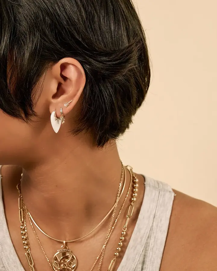 These Le Stelle huggie hoops from Sorellina are a stylish, statement making take on the traditional gold hoop. With their edgy, modern vibe, the 18-carat yellow gold earrings are set with glistening diamonds along their front and five radiating lines anchoring the composition and adding to its dimensional design. The hoops fasten with a latch back closure and are perfect with absolutely everything!