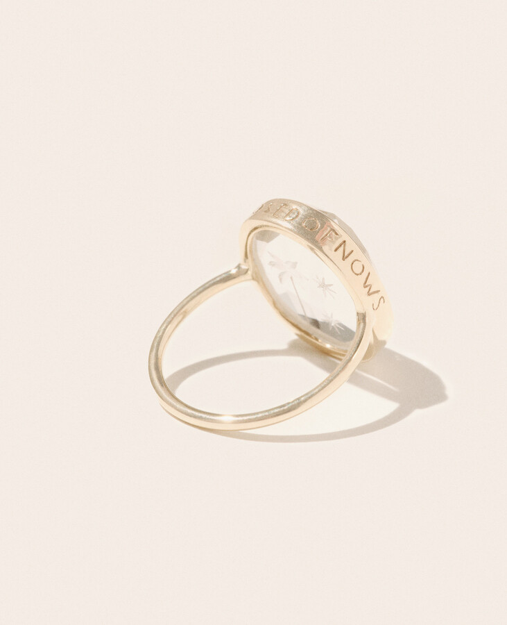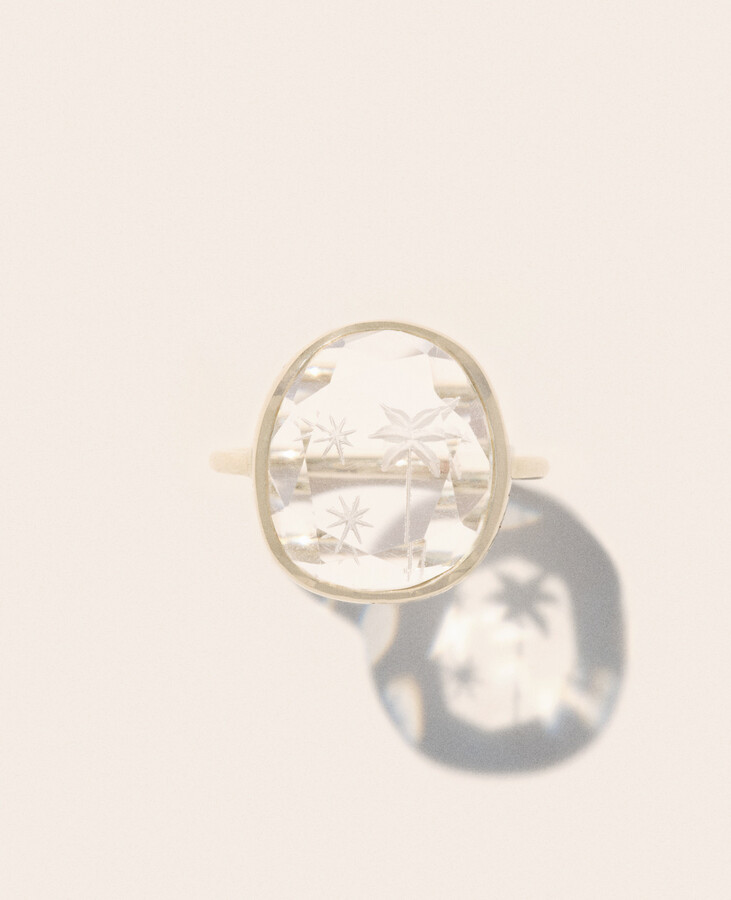 Pascale Monvoisin’s Alba ring is crafted in 9-karat gold and hand-engraved with the phrase “forever is composed of nows.” Set with a faceted crystal etched with palm tree and starburst details, it’s a statement piece designed to be worn solo.