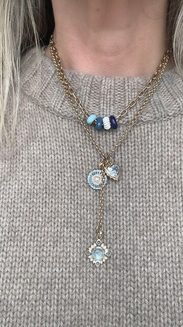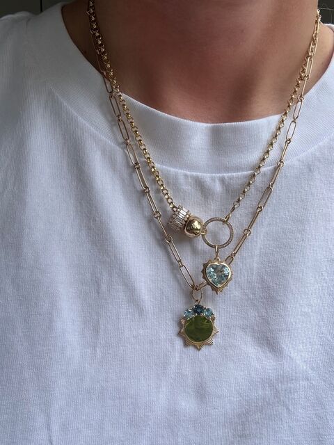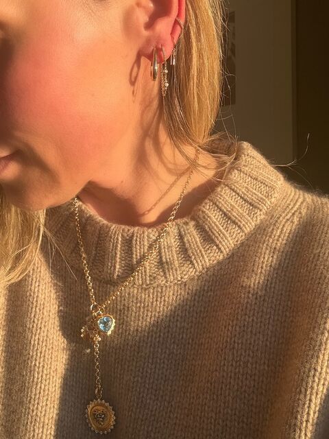LA luminous blue topaz heart, set in warm yellow gold and edged with a radiant sunburst frame. The stone’s serene, oceanic hue brings a sense of calm and clarity, while the golden detailing adds just the right touch of drama.