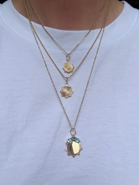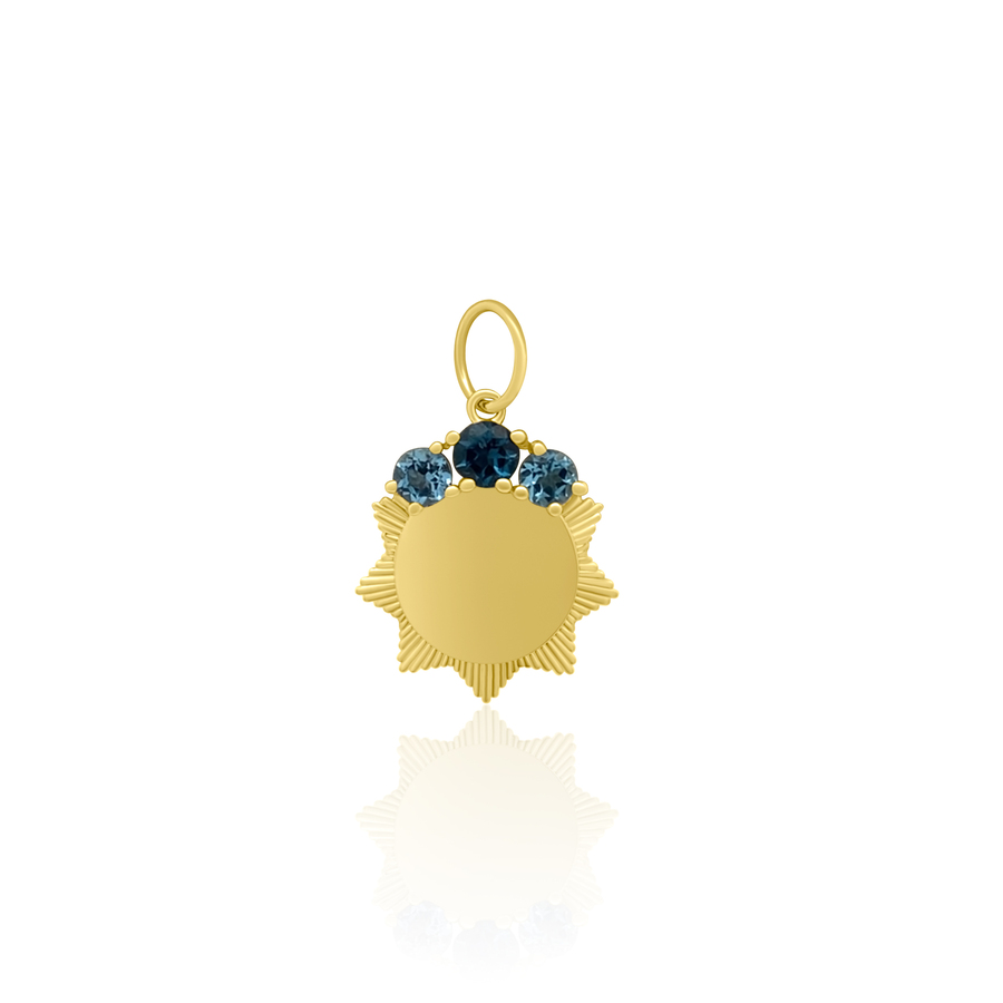 GA modern burst of colour and light. The Blue Topaz Fluted Sol Charm is crafted in solid gold with fine fluted detailing that catches the light beautifully. A trio of vivid blue topaz stones adds a fresh, contemporary edge, while the smooth centre offers the perfect canvas for engraving — a subtle way to make it uniquely yours. Beautiful worn solo or layered to add a pop of colour to your charm stack.