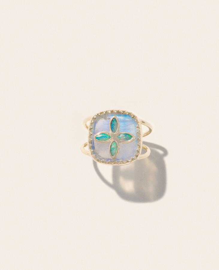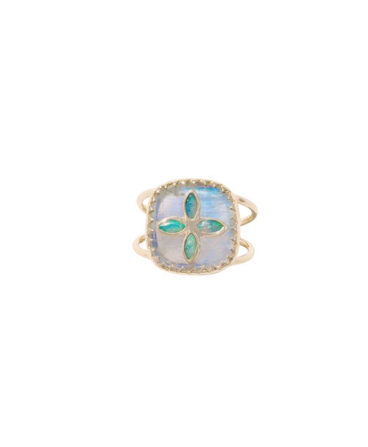 With a subtle play of light and contrast, there is something quietly magical about this Pascale Monvoisin ring. An iridescent square of moonstone is framed by a finely detailed sunray setting in 9K yellow gold, surrounding a cluster of softly shimmering Australian opals at the centre. The delicate double band, also in 9K yellow gold, adds an elegant, feminine finish.