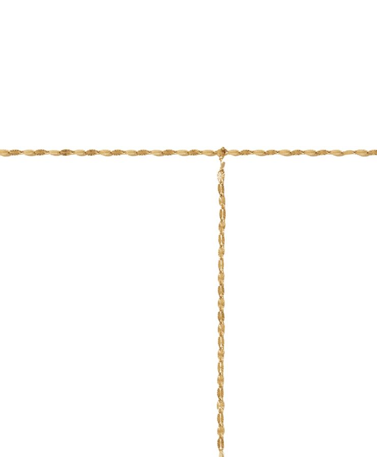 Comporta is an exceptionally light guilloché chain, designed to catch the light with every movement. Its finely faceted gold links shimmer softly against the skin, tracing the neckline before gliding effortlessly towards the bust, where the chain seems to melt into the body.