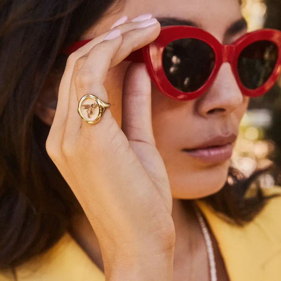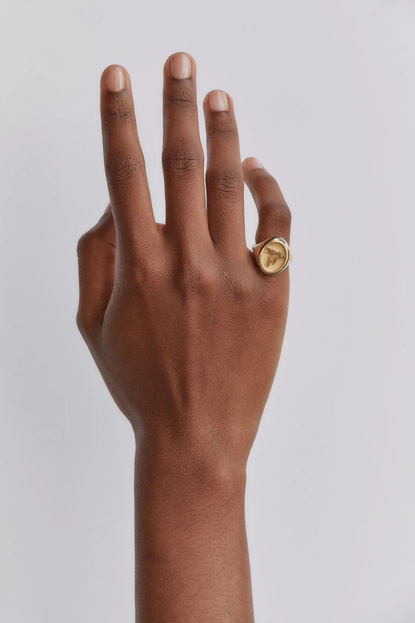 Radiating a confident, style-defining aura, Retrouvai has created a contemporary interpretation of the classic signet ring. Hand-crafted in 14k yellow gold, the signet ring features a three-dimensional flying pig and is inscribed on the inside with the uplifting message ‘anything is possible’. Positioned at the centre of the tiered 14k yellow gold band, this ring effortlessly blends classic elegance with modern flair.