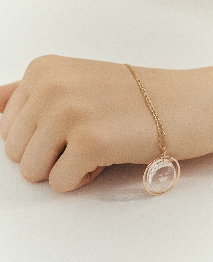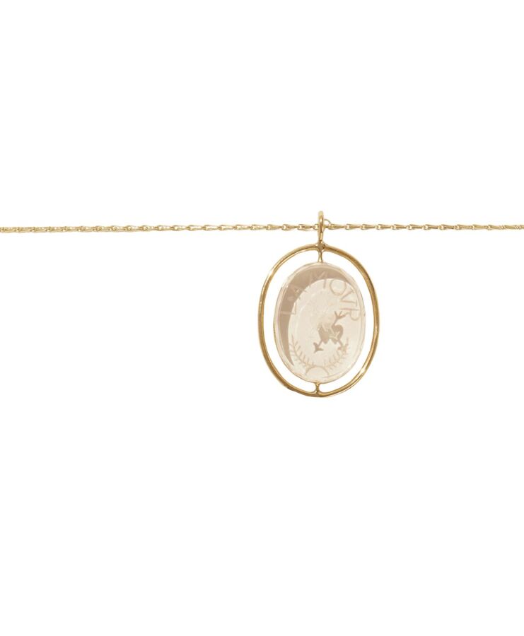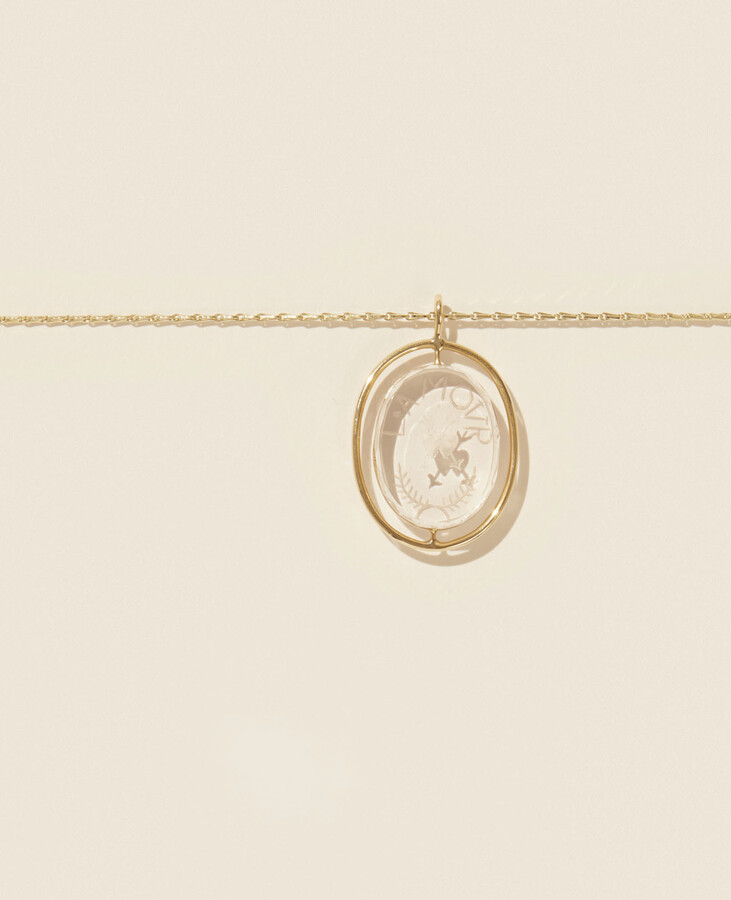 This necklace features a clear, hand-engraved rock crystal pendant etched with the word l’amour and framed in gold. Suspended from a fine chain, the transparent crystal catches the light, allowing the engraving to be seen from every angle.