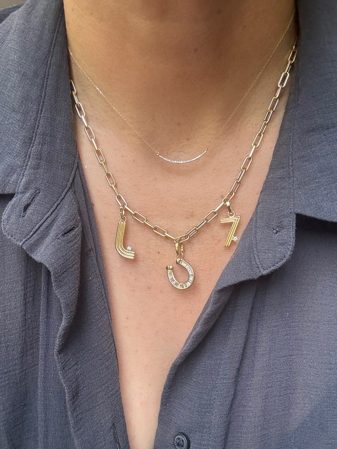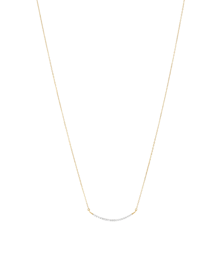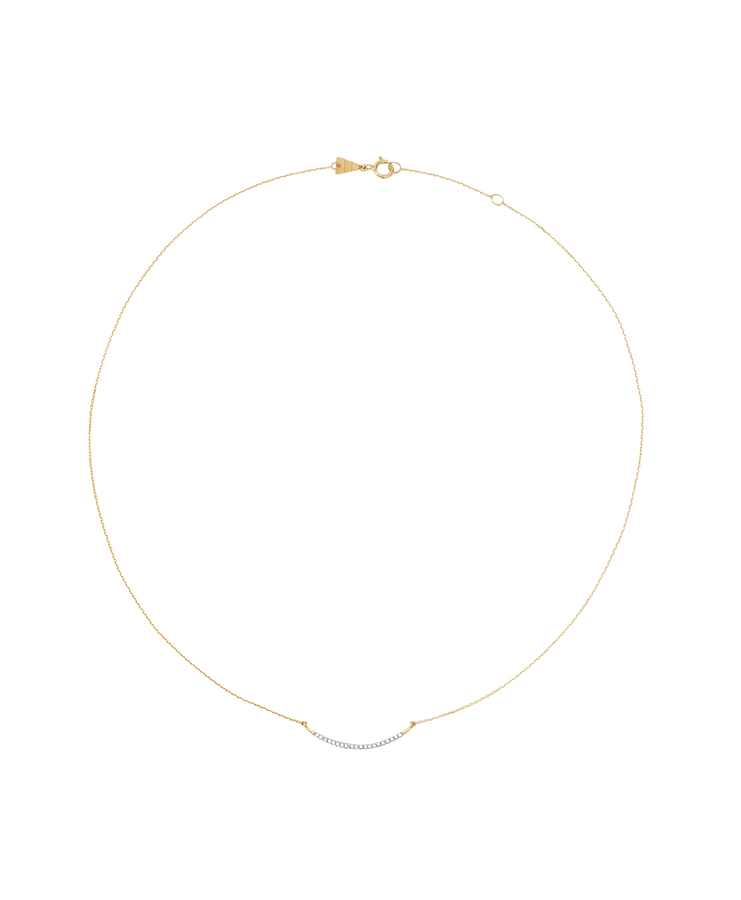 A whisper of sparkle, a curve of brilliance. This pavé diamond necklace traces the collarbone with a glint of understated glamour — delicate, sculptural, and endlessly layerable. Set on a fine gold chain, it’s the kind of barely-there sparkle that pulls every look together without trying too hard. A minimalist's dream with just the right dose of shine.