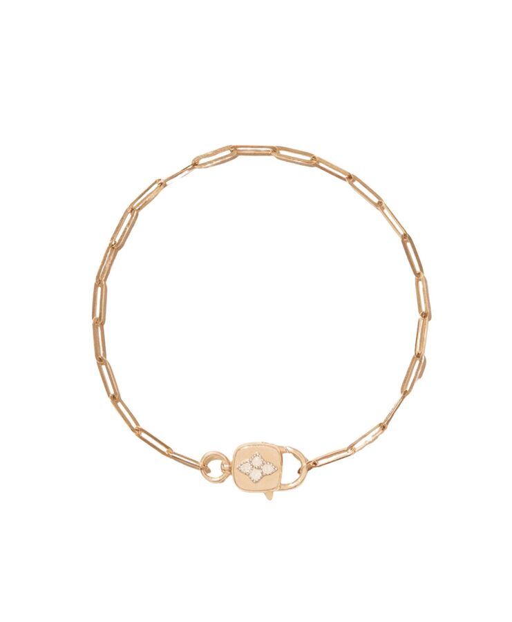 The padlock-inspired clasp on Pascale Monvoisin’s Louise bracelet brings a subtle vintage feel to a modern design. Crafted in 9-karat yellow gold, the sculptural clasp is set with a delicate diamond motif and finished with elongated paperclip-style links that sit effortlessly on the wrist.