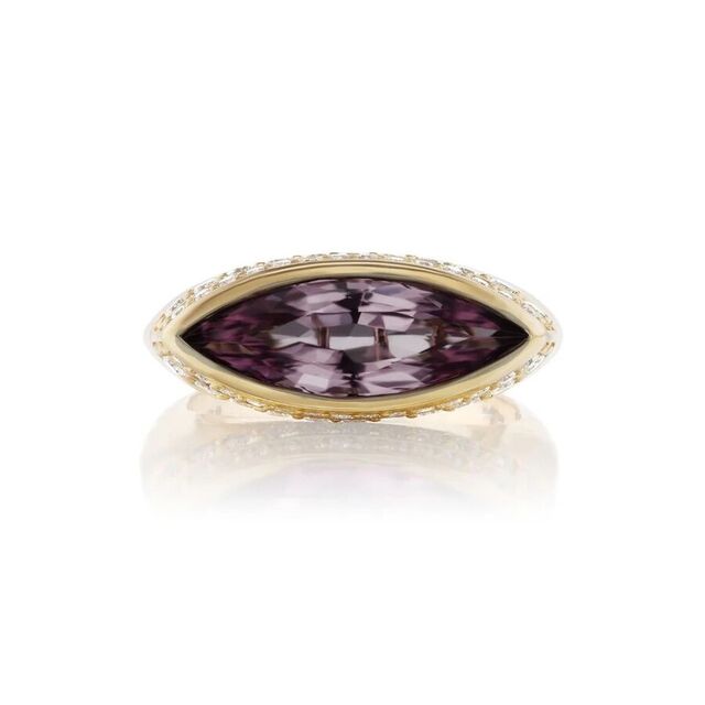A masterpiece of modern elegance. Crafted in 18k gold and set with a striking marquise-cut spinel, this one-of-a-kind ring is framed by rows of pavé-set diamonds that catch the light from every angle. Bold yet refined, it’s the kind of piece that turns quiet confidence into a statement.
