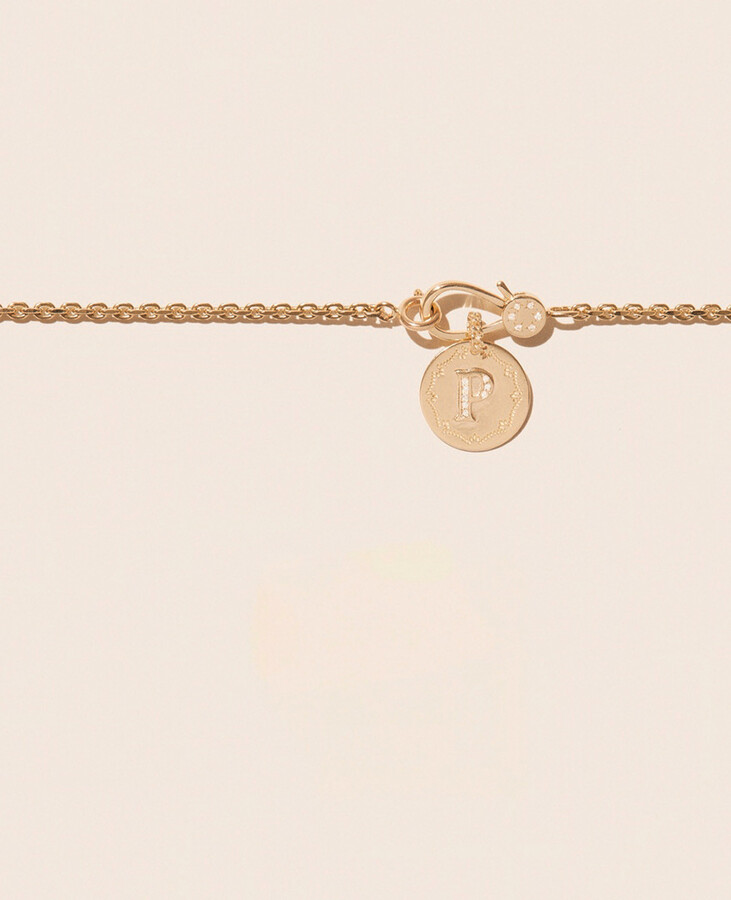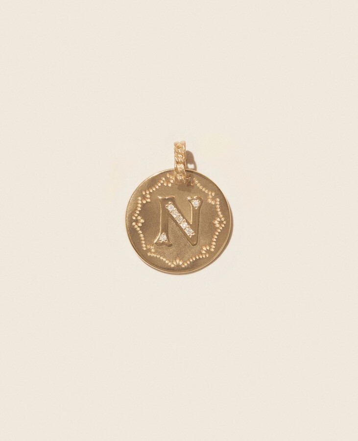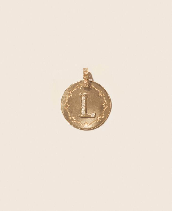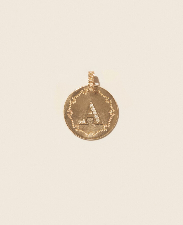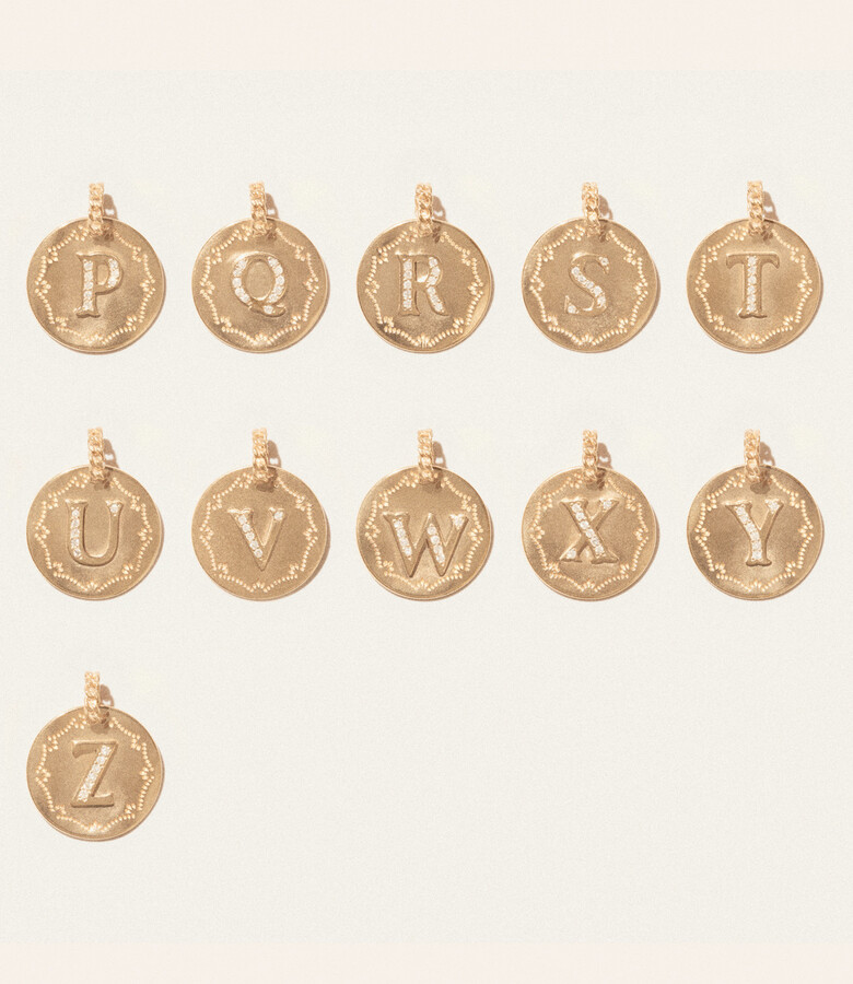 These personalised alphabet charms are crafted in warm gold and designed as small round medallions with an engraved border detail. At the centre, a single pavé-set diamond letter adds a subtle point of sparkle, set against the softly matte gold surface.