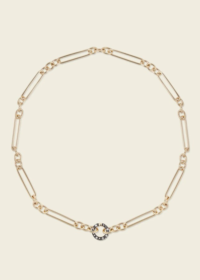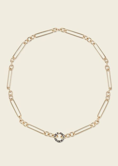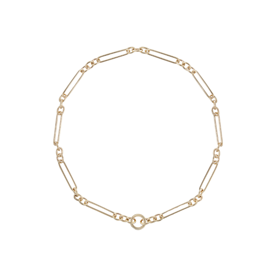 The Trombone chain is Lucy's take on a classic Victorian watch chain. Each elongated link is connected by three rings, all in 14kt yellow gold. The necklace has a gold spring clasp that is designed to be worn to the front and which can be replaced by one of our Connection pieces.